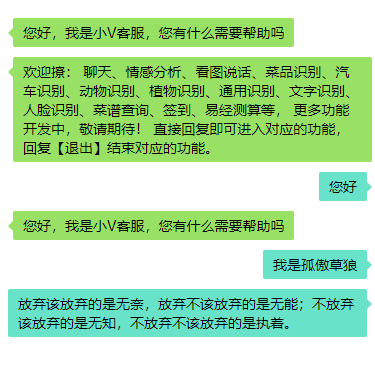 聊天、情感分析、看图说话、菜品识别、汽车识别、动物识别、植物识别、通用识别、文字识别、人脸识别、菜谱查询、签到、易经测算等,